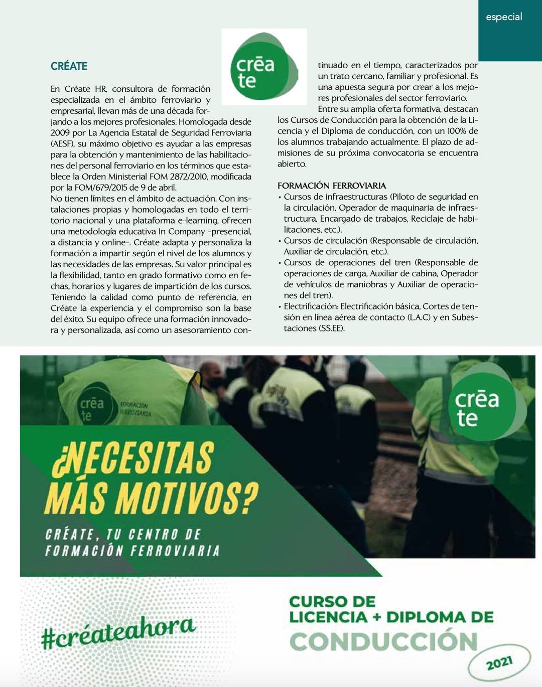 Debido a la demanda existente de formación específica en el ámbito del ferrocarril y al avance tecnológico dentro del sector, la formación es una pieza clave para desarrollar una carrera profesional ferroviaria, además de ser imprescindible en el propio reciclaje dentro del propio puesto de trabajo. Por ello, Vía Libre, la revista del ferrocarril, ha querido dedicar su especial de junio a la «Formación para el ferrocarril». En ella, se recoge la mejor oferta formativa del momento y, entre más de una veintena de empresas, Créate es una de ellas.