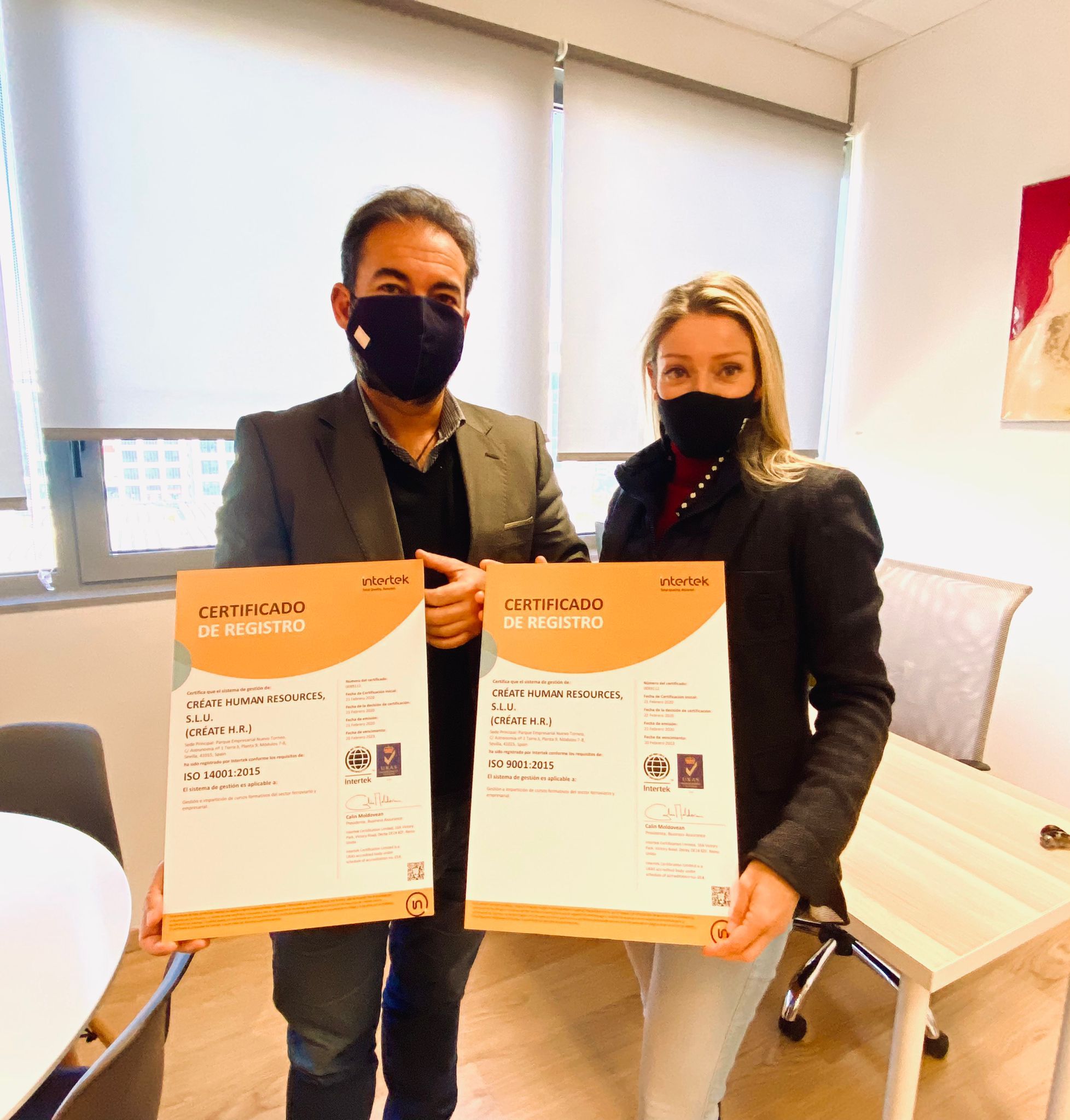 Tras la implantación y mantenimiento del Sistema de Gestión de la Calidad y Gestión Ambiental, Intertek, proveedor líder en el Aseguramiento de la Calidad Total para industrias de todo el mundo, vuelve a hacer entrega a Créate HR de las certificaciones ISO 9001:2015 e ISO 14001:2015.