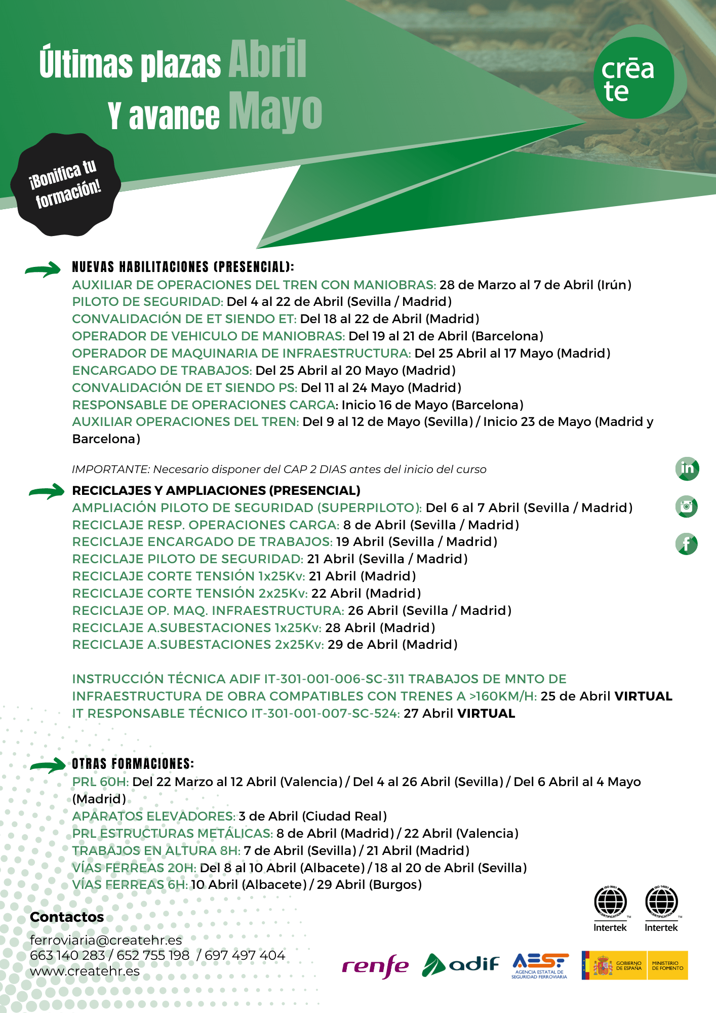 Para más información, escríbenos a ferroviaria@createhr.es o llámanos a 652 755 198 – 697 497 404 – 663 140 283.